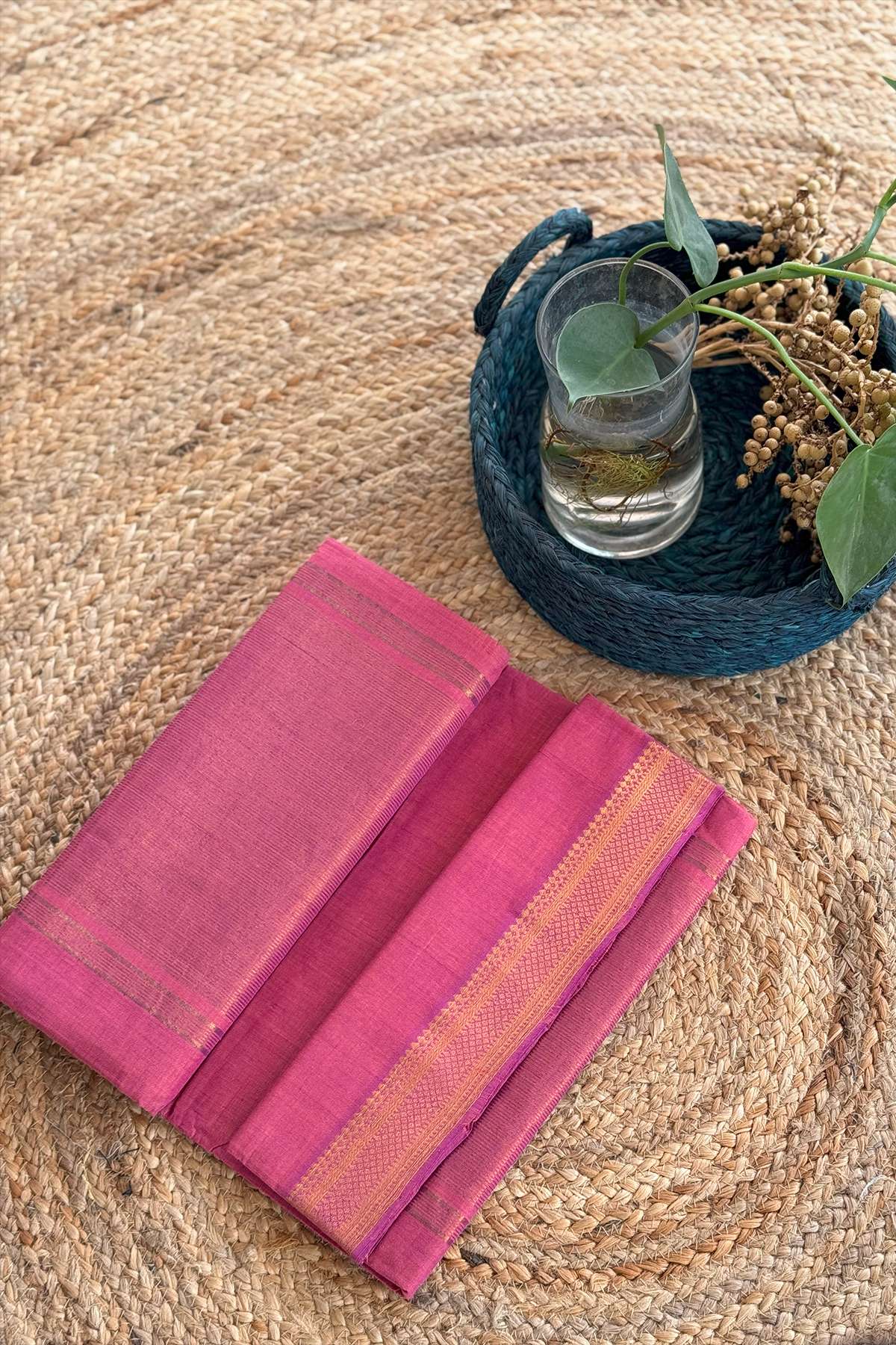 A stunning and elegant pure Mangalagiri handloom cotton saree in a rich pink tone, adorned with a traditional gold zari border. The pallu features delicate gold stripes, maintaining a minimalist and sophisticated look. Perfect for festivals, intimate gatherings, and graceful everyday wear, this saree is lightweight, breathable, and woven by skilled artisans with traditional techniques.